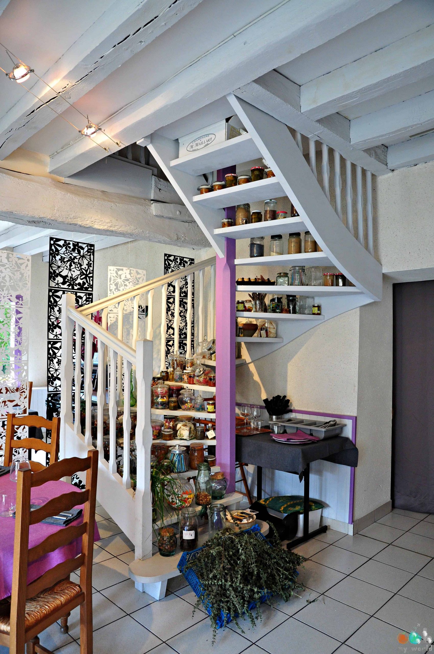 Les rebords de fenêtres, les étagères et même les escaliers recouverts de bocaux vous mettent sur la voie de la philosophie de la maison: ici, on fait tout nous même! Les bocaux regorgent de pâtés, d’huiles parfumées, d’agrumes confits préparés par le chef et sa femme que vous pouvez emporter à la maison.