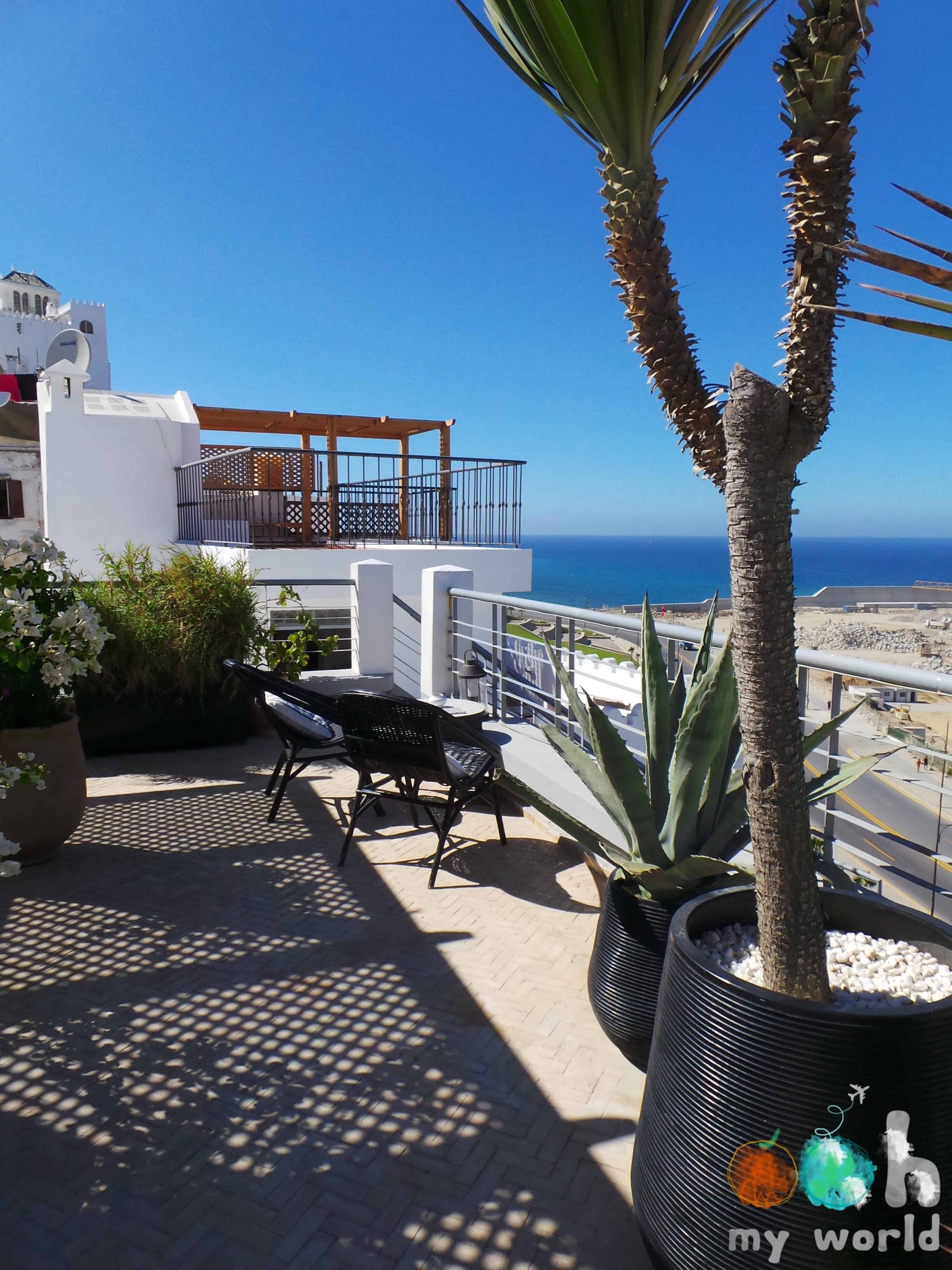 – Le restaurant de l’hôtel Nord Pinus: Le Nord Pinus est un très bel hôtel situé dans l’ancienne maison du calife dans la médina. Si nous avions pu, nous serions restés là-bas mais cet hôtel était un peu hors budget (170 euros la nuit) mais je n’ai pas pu résister à l’appel de leur magnifique terrasse et de leur restaurant (malgré le prix du diner: 30 euros pour le dîner). Depuis leur terrasse sur le toit, vous pouvez voir toute la ville de Tanger. Au coucher du soleil, la vue est incroyable! Nous nous sommes installés pour prendre un cocktail et nous serions bien restés pendant quelques heures dans leurs fauteuils confortables mais la perspective du dîner nous a fait changer d’avis.